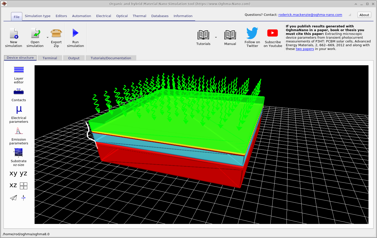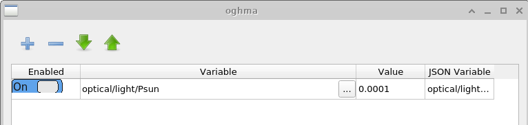 The purpose of the Patch window is to change parameters in the virtual simulation. For example in our case we which to simulate a dark JV curve and nine different light intensities, therefore for each of these simulation the light intensity must be correctly adjusted. If one opens the patch window for \(light\_0.0001\), you will see that the simulation variable optical/light/Psun which controls the light intensity is set to \(0.0001\). If one opens the patch window for dark, one will see that the value of optical/light/Psun is set to \(0.0\). In this way using the same base simulation multiple experiments under different conditions can be simulated.