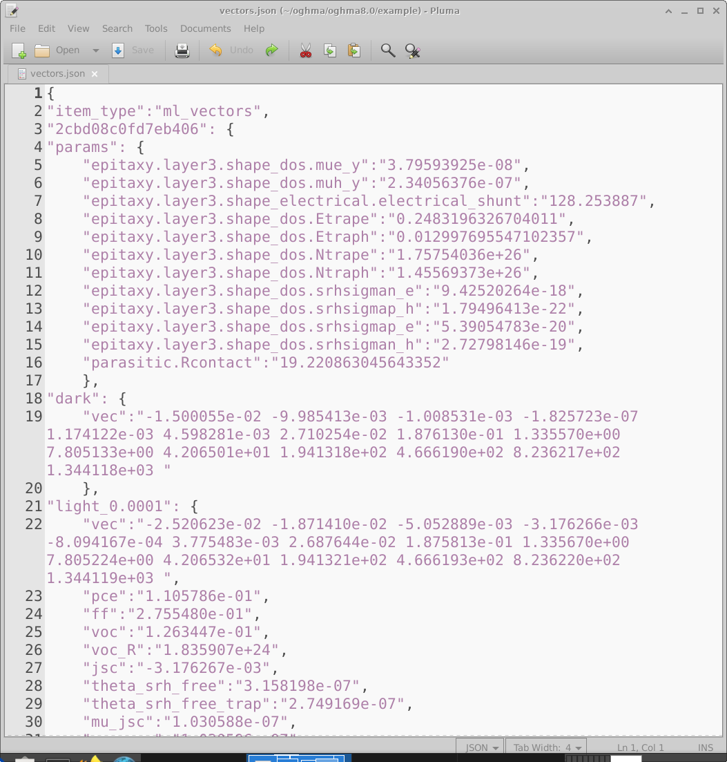 This vectors file is a json file containing all the data needed for training a machine learning algorithm. Each virtual device in the data set will have a section in the file. So for example in this figure we are looking at the section relating to device 2cbd08c0fd7eb406 (line 3), we can see under the heading params what electrical parameters were randomly chosen for this device. Followed by the vectors representing the dark JV curve (line 19) and the light JV curve at 0.0001 Suns (line 22). These values in this example are in \(Am^{-2}\), however they will always be the same as the file from which they are extracted. So in this case jv.dat contains Volts v.s. \(Am^{-2}\) therefore the values of the vector are \(Am^{-2}\). After this key device parameters such as PCE are dumped. There will be one entry in this file for each virtual device generated. Once you have this file, you can feed it into the machine learning algorithm of your choice. Some users report that it is easier to feed this data into tensor flow if it is first converted into a CSV file, this can be done using the standard Python libraries.