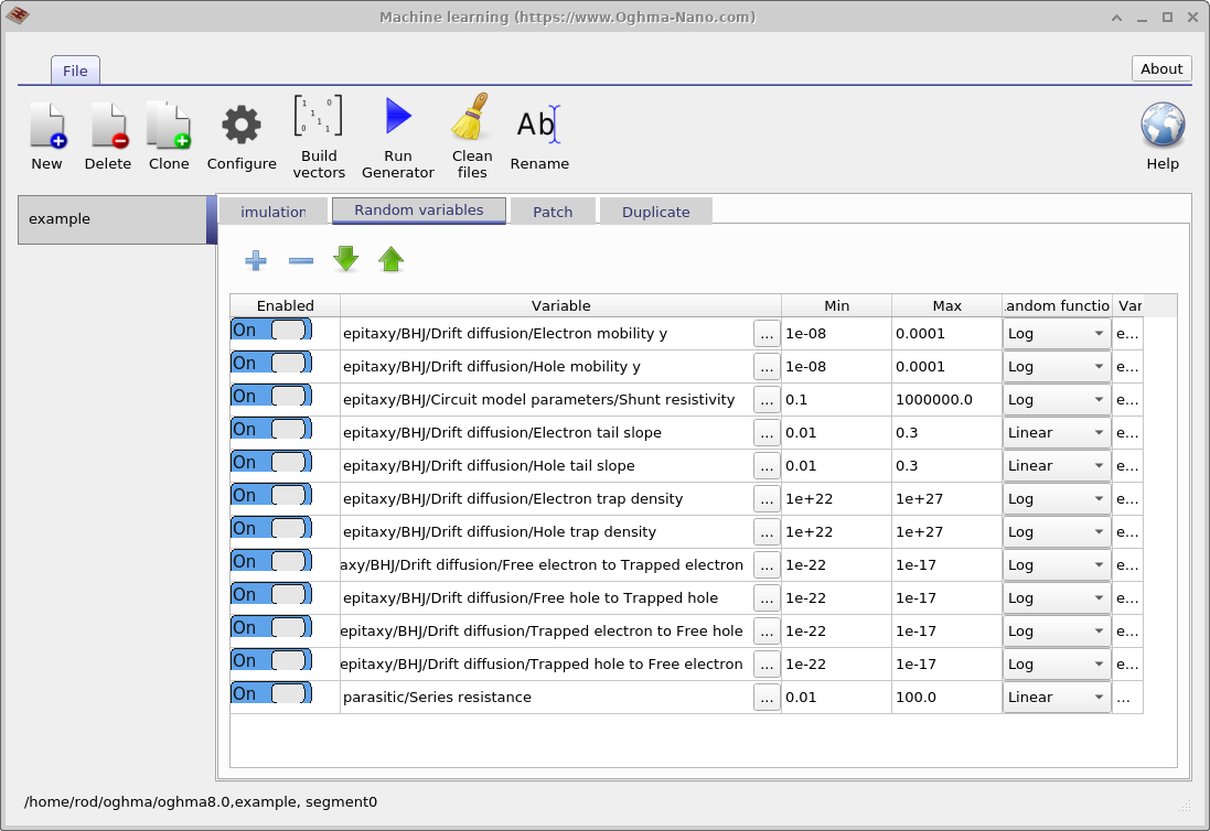 The next step is to set up which variables one wishes to randomize, this is done in the Random variables tab of the main machine learning window. The window has five columns; the first column (Enabled) dictates if the random variable is used; the second column (Variable) sets which variable is changed; the third column (Min) sets the minimum allowed value of the random value; the forth column (Max) sets the maximum allowed value of the random value; and the final column (Random function) dictates if the random variable should be chosen on a log or linear scale. Log scales are recommended for variables which span multiple orders of magnitude while linear scales are recommended if the variable spans around an order of magnitude. A log distribution will ensure that an evenly distributed span of numbers are chosen across the range when viewed on a log scale. An example of a linear parameter would be Urbach energy as it typically would vary from 30 to 150 meV and example of a log variable would be trap density as it typically can vary from \(1 \times 10^{15} m^{-3} - 1 \times 10^{25} m^{-3}\).