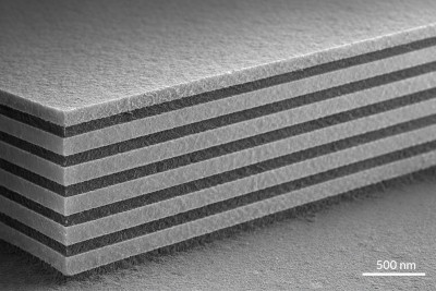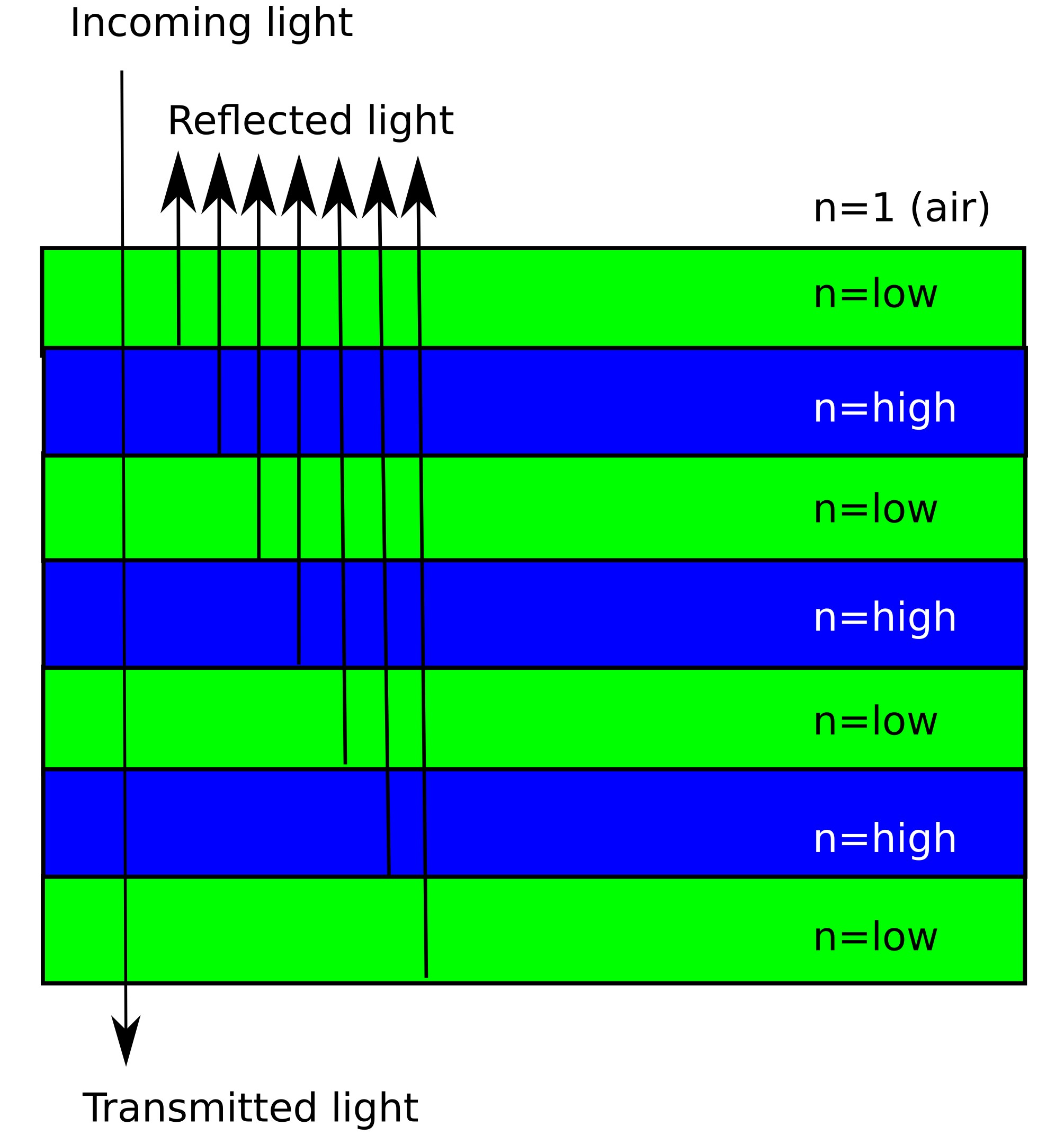 The key idea is shown in ??. When light hits the structure, each interface reflects a small amount. These reflected waves can add together coherently, producing a strong overall reflection. A real structure looks like the multilayer stack shown in ??. Although each individual reflection is weak, the repeated layering allows the reflections to build up.