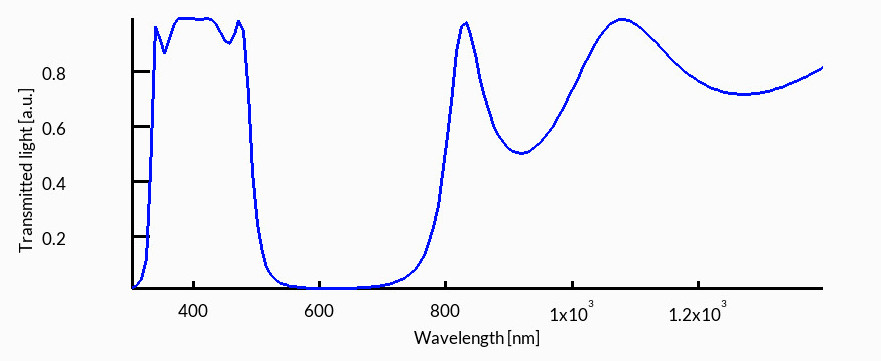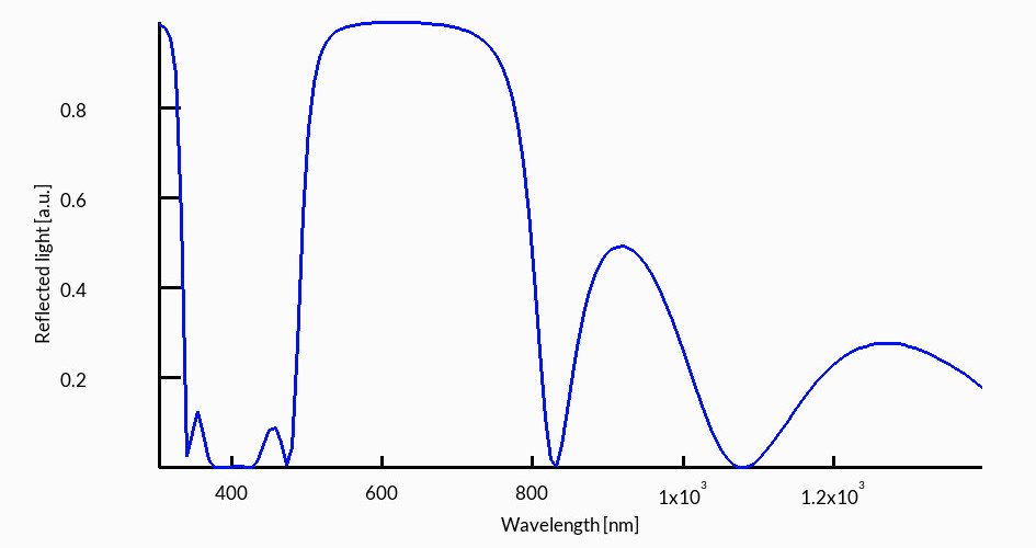 To make this work, the layer thicknesses are chosen carefully. In a standard quarter-wave design, each layer has an optical thickness of one quarter of a target wavelength \(\lambda_0\), so that \(n_1 d_1 = \lambda_0/4\) and \(n_2 d_2 = \lambda_0/4\). This ensures that reflections from successive layers return in phase and reinforce each other. The result is very clear in the simulation outputs. Over a certain wavelength range, the structure reflects almost all the incoming light (see ??), while very little light is transmitted through the stack (see ??).